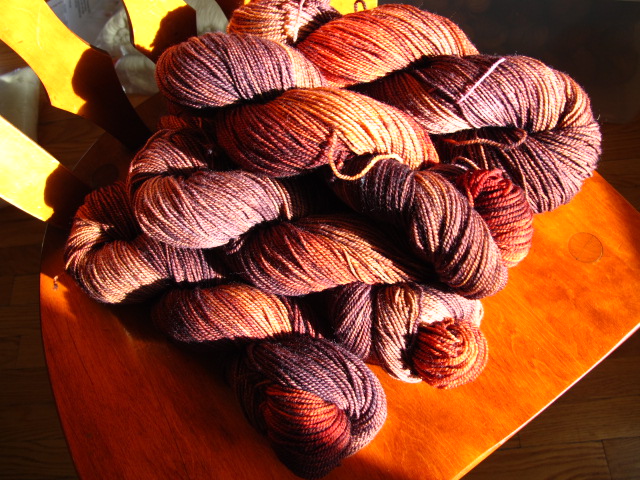 I have been dyeing and labeling and packing up yarn for Rhinebeck like crazy. My laptop came back from "my" computer guy in tip top shape on Monday, and boy was I ever glad to have my little machine back! Still, I remain the lame blogger.